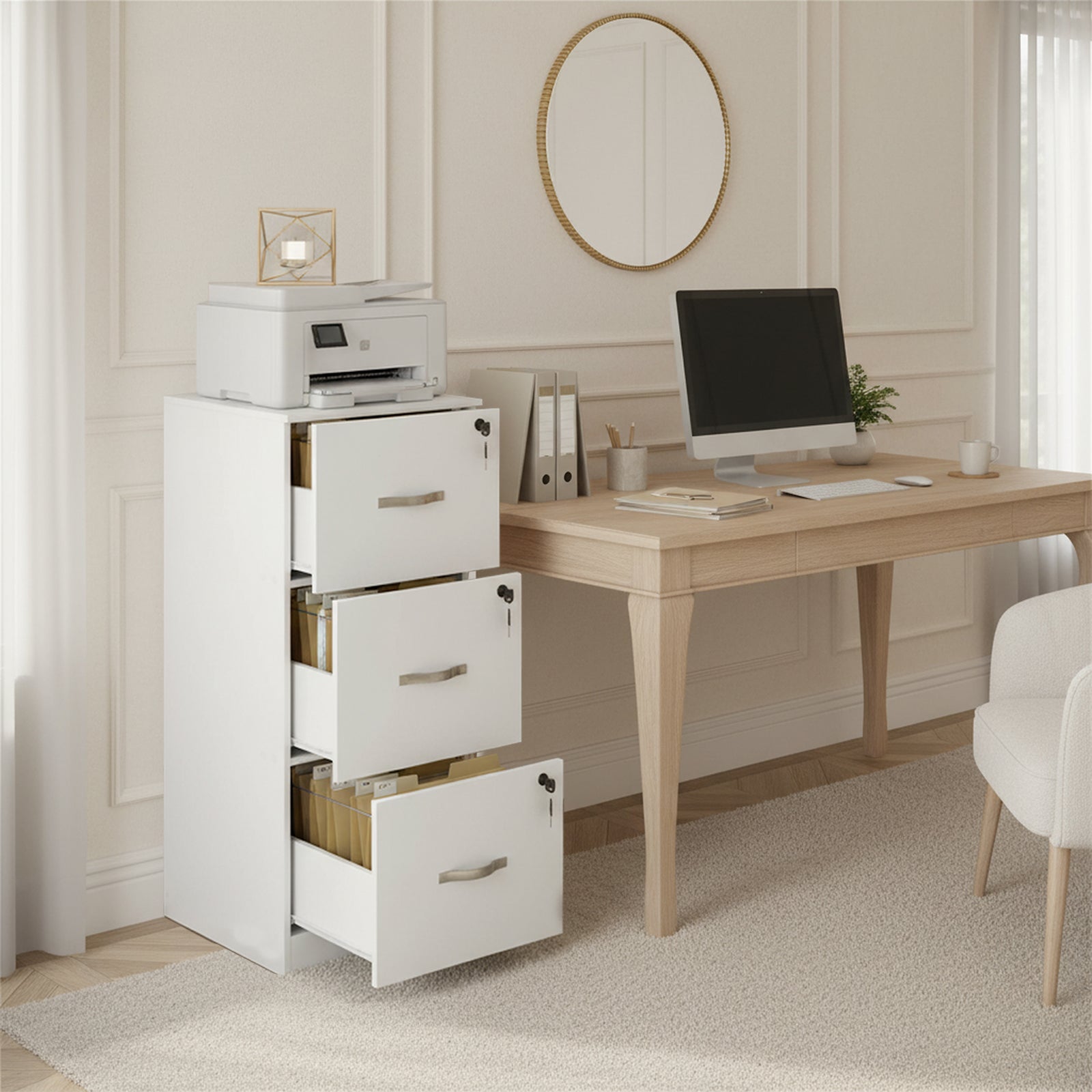 Caisson à roulettes verrouillable avec 3 tiroirs, barres de suspension réglables pour dossiers suspendus au format A4 et lettre