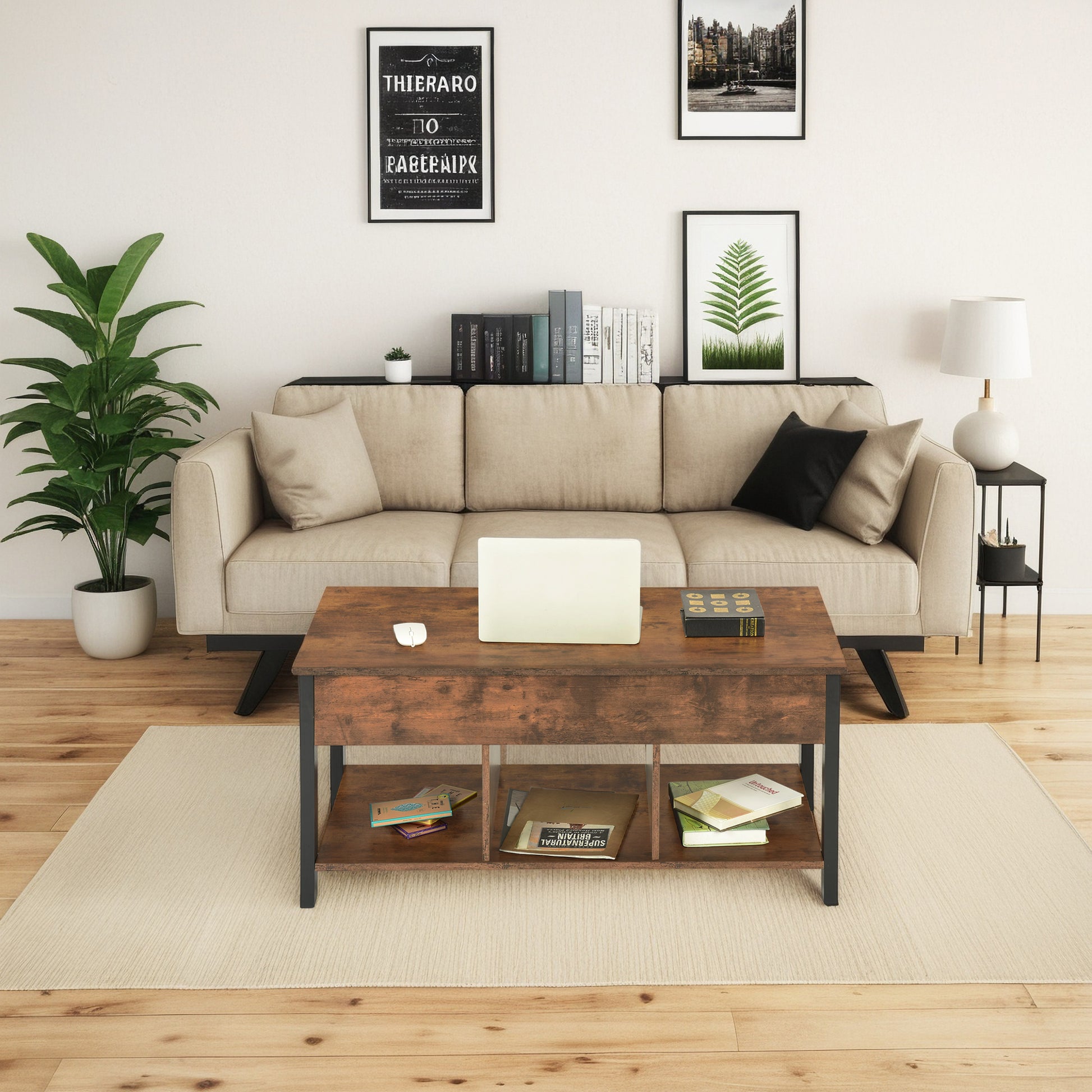 Table Basse, Table de Salon avec Plateau Relevable, avec Rangement Ouvert et Compartiment Caché, Barres en Forme de X, 48 x 100 x (46-60) cm, Marron Rustique et Noir