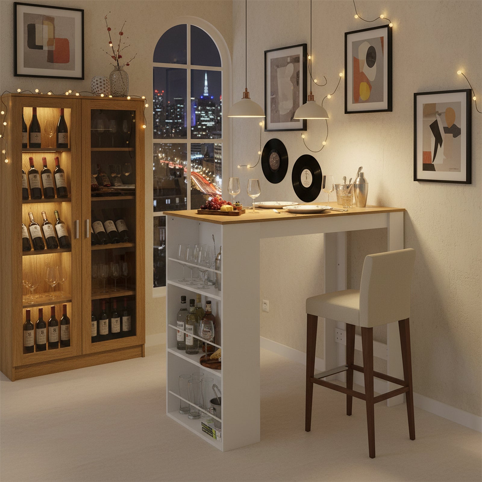 Table de Bar avec Rangement, Table de Bar pour Cuisine,112 × 57 × 106 cm, Blanc et chêne Clair